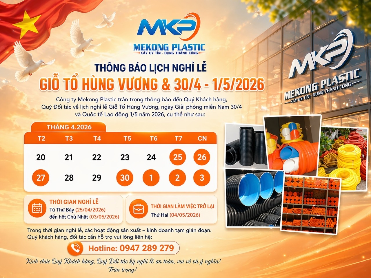 Trang chủ » Tin tức » THÔNG BÁO LỊCH NGHỈ LỄ GIỖ TỔ HÙNG VƯƠNG VÀ LỄ 30/04 – 01/05/2026 THÔNG BÁO LỊCH NGHỈ LỄ GIỖ TỔ HÙNG VƯƠNG VÀ LỄ 30/04 – 01/05/2026 NHỰA HDPE VÀ CHẤT LIỆU BẢO VỆ TUYỆT VỜI CHO CÁC THIẾT BỊ Tìm hiểu tính năng của ống HDPE D160 Bảng Báo Giá Ống Nhựa Gân Xoắn HDPE SANTO tại Vũng Tàu Bảng Giá Ống nhựa PVC Santo năm 2024 Công ty TNHH SX và TM Mekong Plastic trân trọng thông báo: Bài viết liên quan ỐNG NHỰA THOÁT NƯỚC THẢI HDPE ỐNG ĐƠN HAY ỐNG TỔ HỢP? SANTO ỨNG DỤNG CÔNG NGHỆ IN LASER UV TRÊN TEM NHÃN & SẢN PHẨM BẢNG GIÁ ỐNG NHỰA XOẮN HDPE Tổng hợp phụ kiện ống nhựa xoắn HDPE Santo 🔶 ỐNG NHỰA XOẮN HDPE D130/100 – GIẢI PHÁP BẢO VỆ CÁP ĐIỆN HIỆU QUẢ 🔶 Ống Nhựa Xoắn HDPE Santo 65/50 – Giải Pháp Tối Ưu Cho Hệ Thống Cáp Tại Nhơn Trạch, Đồng Nai 🔶 ỐNG NHỰA XOẮN HDPE D130/100 – GIẢI PHÁP BẢO VỆ CÁP ĐIỆN HIỆU QUẢ 🔶